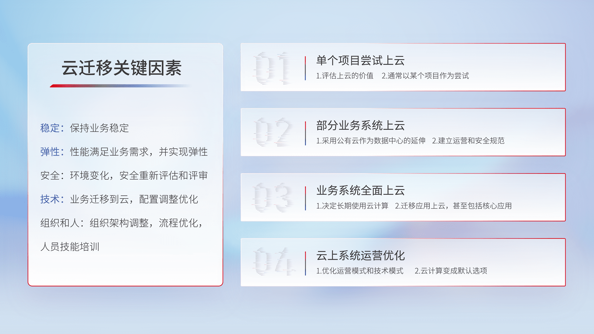 结合实际业务,,,从规划设计、、、、云平台选型、、、云原生改造、、数据迁移、、集成交付,,,迁移全过程为客户识别最佳上云路径,,,,做好风险识别管理,,设计网络架构、、、、身份权限、、安全审计合规、、、、操作审计、、、日志审计、、、、监控告警策略、、、多站点容灾设计等,,对云上基础设施进行整体规划,,提升IT治理水平,,,,以满足弹性、、、、高可用、、、高性能的需求。。